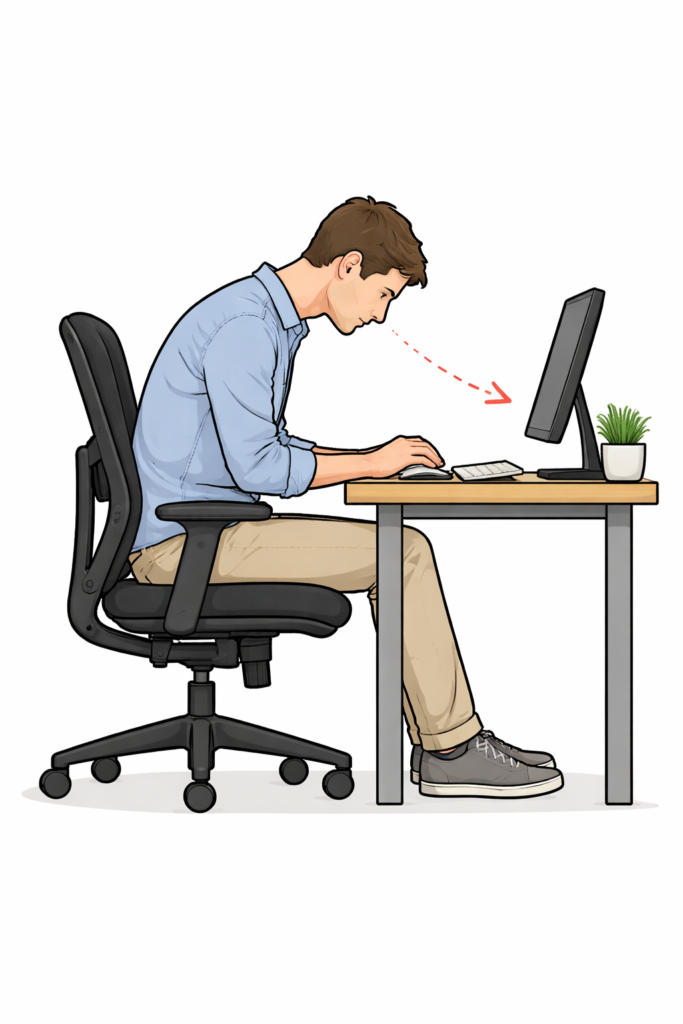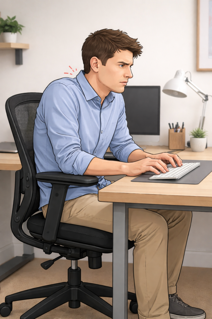 An ergonomic chair usually does not cause neck pain by itself. Neck pain often comes from screen height, armrest position, or sitting too still for long periods.